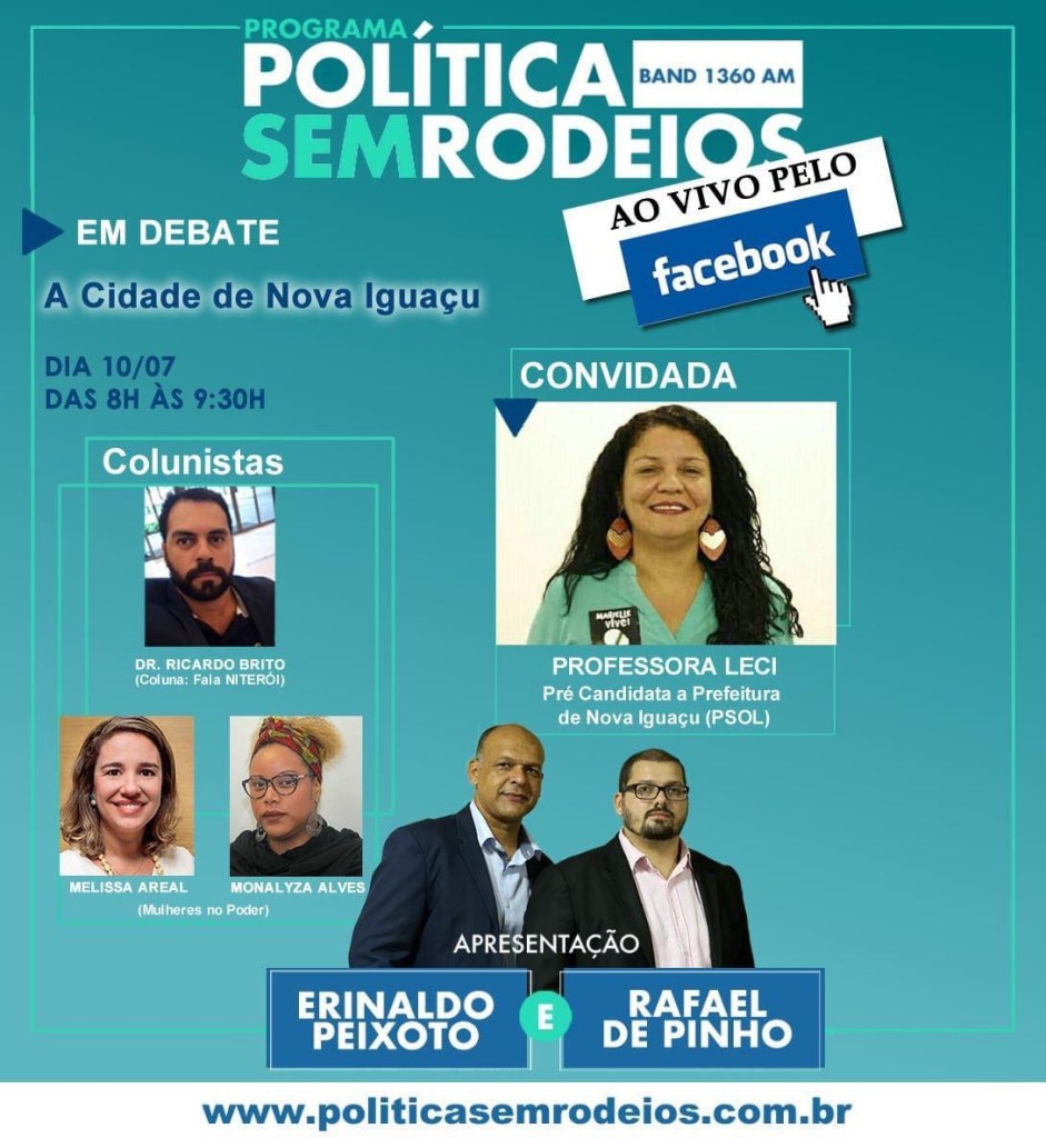 Em nosso próximo programa nesta sexta-feira, dia 10-07, vamos conversar #aovivo com a professora LECI ( Pré- Candidata a #Prefeitura de #NovaIguaçu (#PSOLRJ).