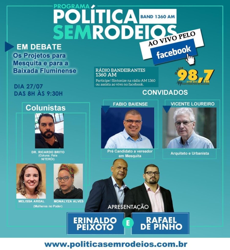 Em nosso programa, desta segunda-feira, dia 27-07, vamos conversar ao vivo com o pré candidato pela cidade de Mesquita: Fábio Baiense (SD) e o Arquiteto e Urbanista: Vicente Loureiro.