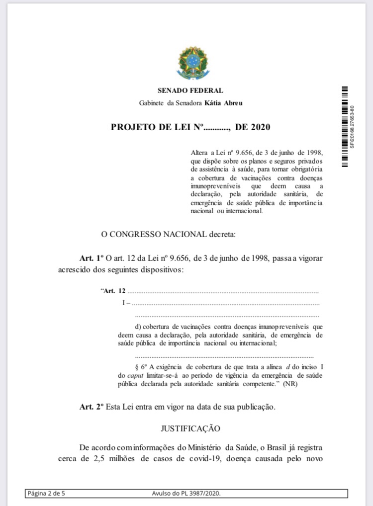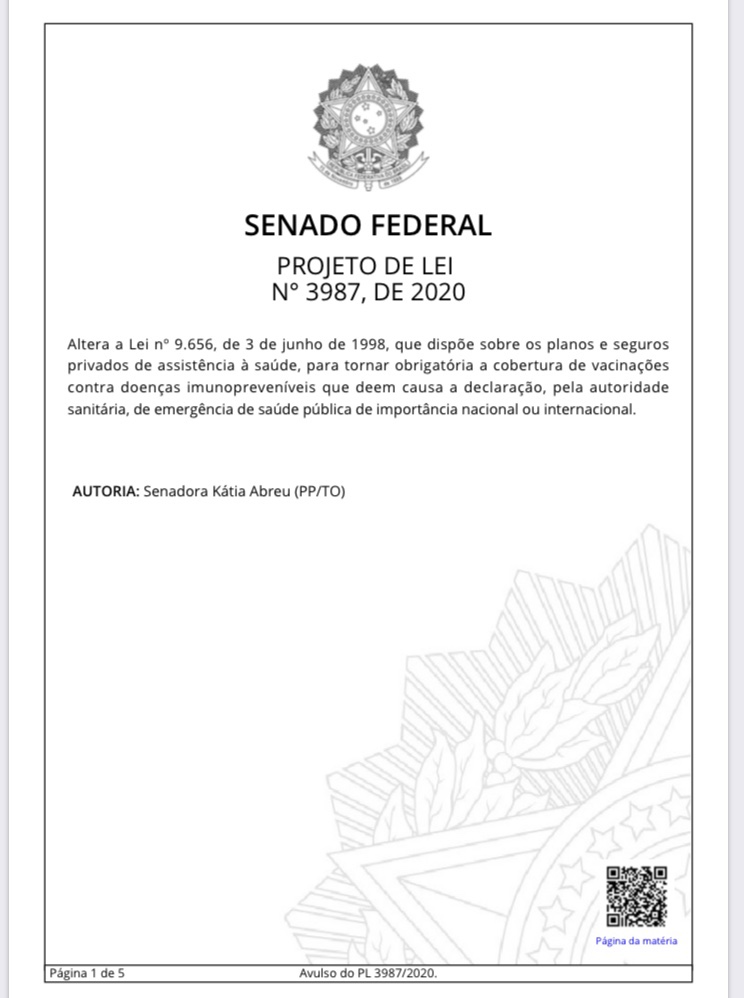 A proposta que torna obrigatória a cobertura de vacinações pelos planos de saúde foi apresentada pela senadora da Kátia Abreu (PP-TO). De acordo com o PL 3.987/2020, a exigência de cobertura contra doenças imunopreveníveis se limita ao período de vigência da emergência de saúde pública declarada pela autoridade sanitária competente.