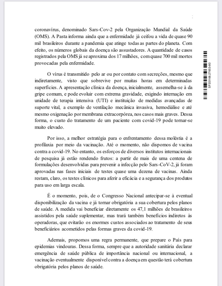 “A medida vai beneficiar diretamente os 47,1 milhões de brasileiros assistidos pela saúde suplementar, mas trará também benefícios indiretos às operadoras, que evitarão os enormes custos associados ao tratamento de seus beneficiários acometidos pelas formas graves da covid-19. Ademais, propomos uma regra permanente, que prepare o país para epidemias vindouras”, declarou.