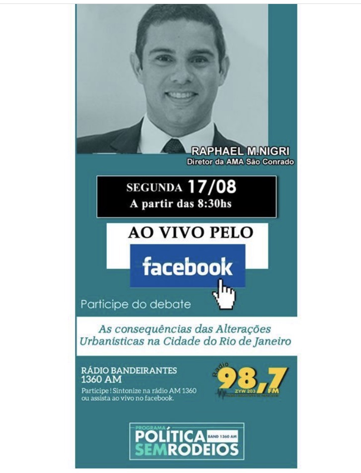Nesta segunda-feira, dia 17-08, vamos conversar ao vivo com o diretor da associação de moradores de São Conrado: Raphael Nigri.