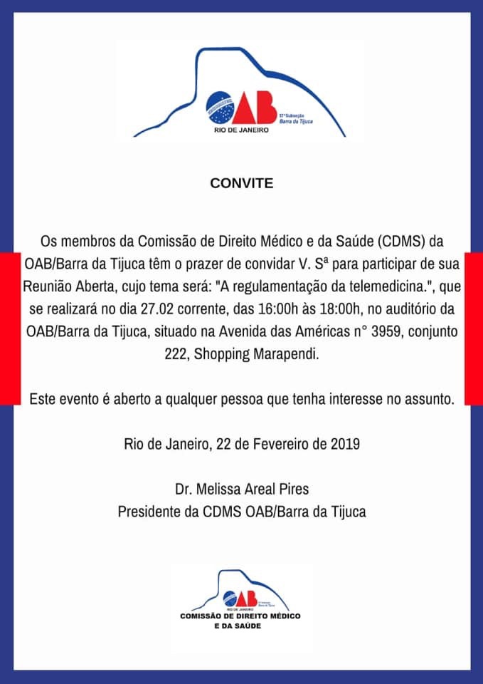 Comissão de Direito Médico e da Saúde da OAB Barra da Tijuca – Reunião Aberta – A regulamentação da telemedicina – 27/02/2018