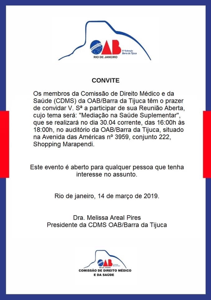 Comissão de Direito Médico e da Saúde da OAB Barra da Tijuca – Reunião Aberta – Mediação na Saúde Suplementar – 30/4/2019