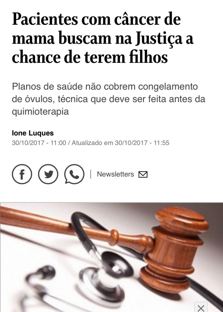 Jornal O Globo – 30/10/2017 – Pacientes com câncer de mama buscam na Justiça a chance de terem filhos outubro 30, 2020outubro 30, 2020 / Melissa Areal Pires https://oglobo.globo.com/economia/defesa-do-consumidor/pacientes-com-cancer-de-mama-buscam-na-justica-chance-de-terem-filhos-22008490?fbclid=IwAR32iTFoNQ856HWDPpDRyPkpWtwol1jtF3AntnPCN_PP3DuCNeGvKBfDOLU Compartilhe Clique para compartilhar no X(abre em nova janela) 18+ Clique para compartilhar no Facebook(abre em nova janela) Facebook Clique para enviar um link por e-mail para um amigo(abre em nova janela) E-mail Clique para imprimir(abre em nova janela) Imprimir Clique para compartilhar no LinkedIn(abre em nova janela) LinkedIn Clique para compartilhar no Tumblr(abre em nova janela) Tumblr Clique para compartilhar no WhatsApp(abre em nova janela) WhatsApp Clique para compartilhar no Pinterest(abre em nova janela) Pinterest Clique para compartilhar no Telegram(abre em nova janela) Telegram Curtir Carregando... Relacionado