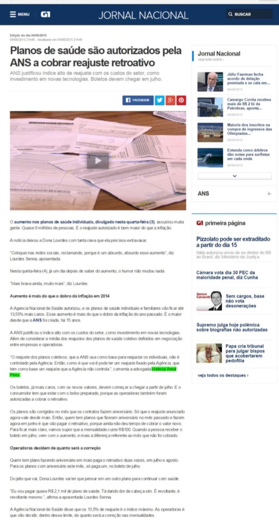 Jornal Nacional – Planos de saúde são autorizados pela ANS a cobrar reajuste retroativo – 04/6/2015 dezembro 16, 2020junho 4, 2021 / Melissa Areal Pires Assista aqui: http://g1.globo.com/jornal-nacional/noticia/2015/06/planos-de-saude-sao-autorizados-pela-ans-cobrar-reajuste-retroativo.html Compartilhe Clique para compartilhar no X(abre em nova janela) 18+ Clique para compartilhar no Facebook(abre em nova janela) Facebook Clique para enviar um link por e-mail para um amigo(abre em nova janela) E-mail Clique para imprimir(abre em nova janela) Imprimir Clique para compartilhar no LinkedIn(abre em nova janela) LinkedIn Clique para compartilhar no Tumblr(abre em nova janela) Tumblr Clique para compartilhar no WhatsApp(abre em nova janela) WhatsApp Clique para compartilhar no Pinterest(abre em nova janela) Pinterest Clique para compartilhar no Telegram(abre em nova janela) Telegram Curtir Carregando... Relacionado
