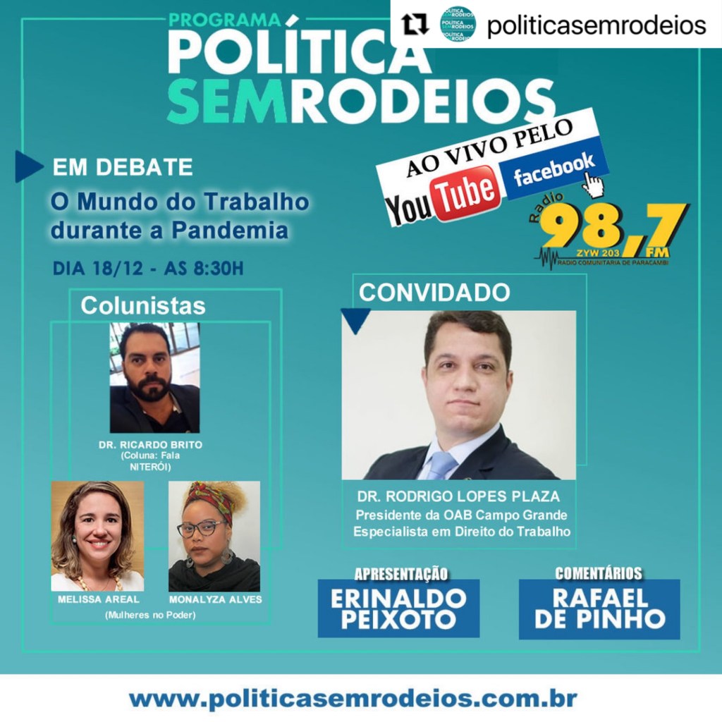 Nesta sexta-feira, dia 18-12, vamos debater ao vivo sobre o Mercado de Trabalho em tempos de Pandemia, com o Dr. Rodrigo Plaza.