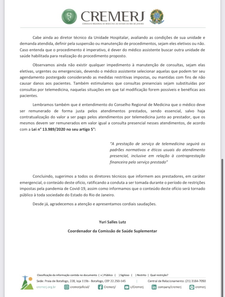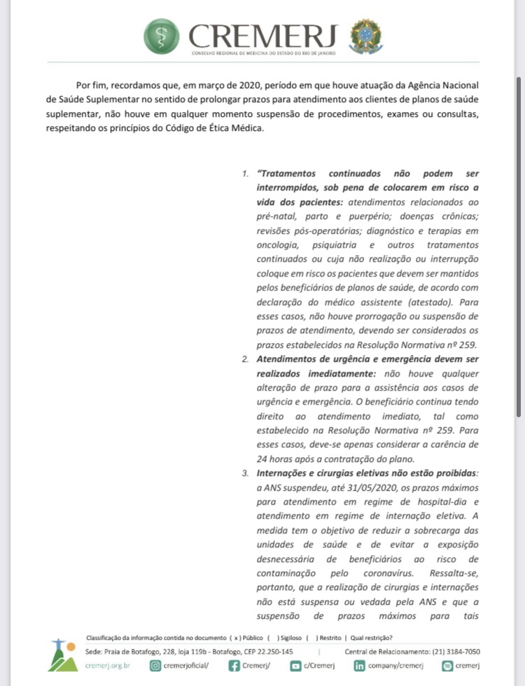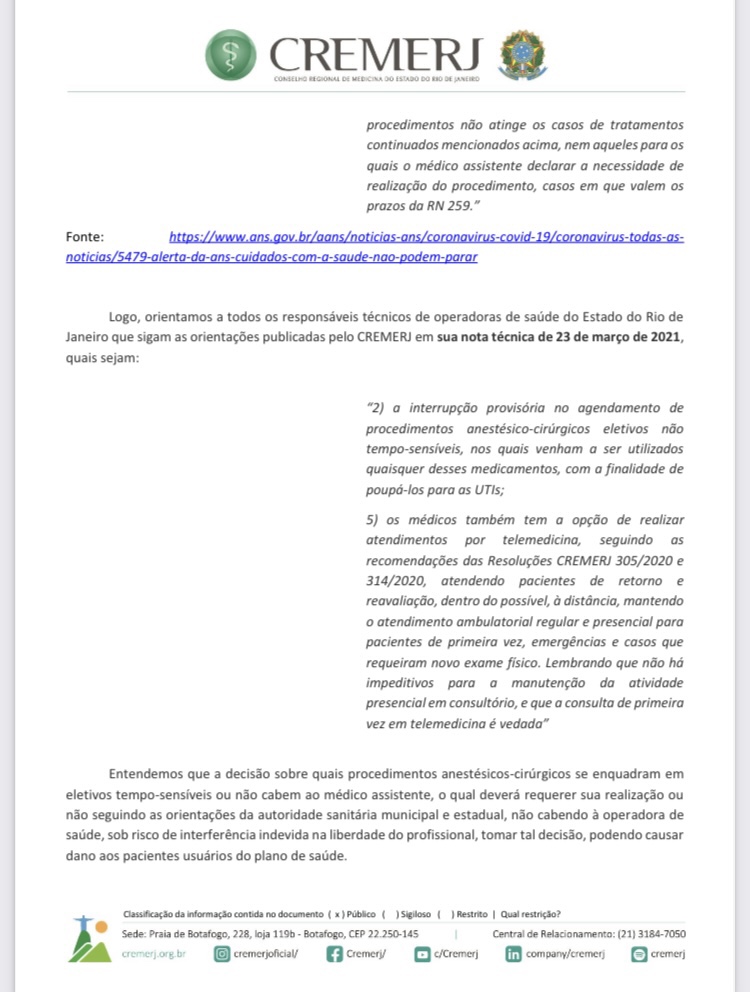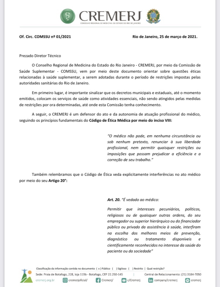 O CREMERJ, por meio da Comissão de Saúde Suplementar (Comssu), divulgou em 26/3/2021, documento com orientações sobre questões éticas relacionadas à saúde suplementar dirigidas às operadoras de saúde e aos médicos prestadores, que deverão ser adotadas durante o período de restrições impostas pelas autoridades sanitárias do Rio de Janeiro, que vai de 26 de março a 4 de abril.