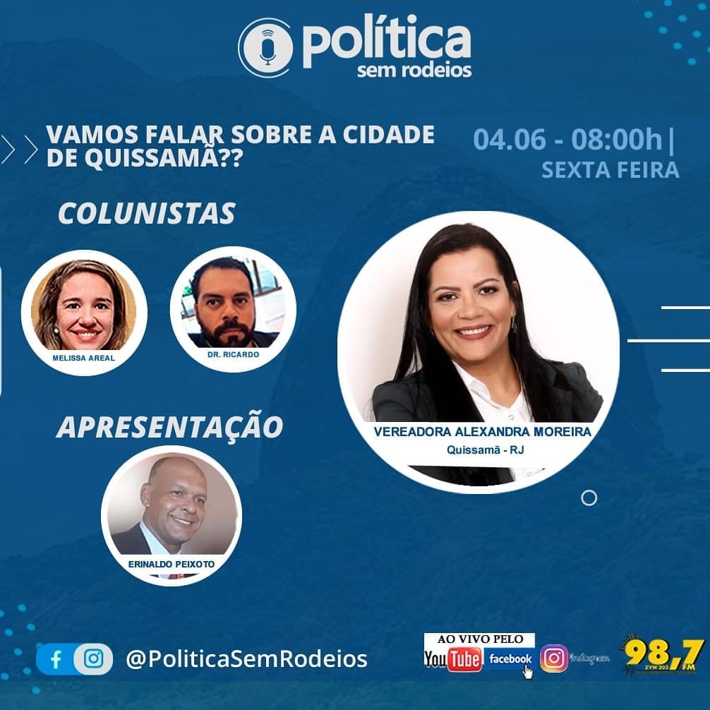 Na próxima, sexta-feira, dia 04-06-2021, debateremos sobre a cidade de Quissamã, no Norte Fluminense com a vereadora, Alexandra Moreira. ( @alexandramoreira.20).