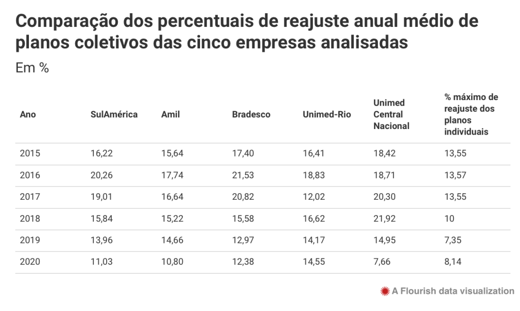 A operadora diz levar em consideração variáveis como o crescimento dos custos médicos, ampliação do rol de coberturas, entre outras, e que os reajustes são estabelecidos em comum acordo com as empresas clientes, conforme determina a legislação.