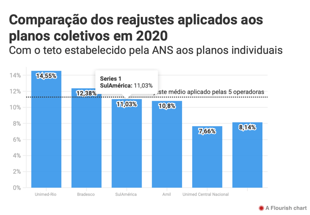 Em seguida por Bradesco, 12,38%; SulAmérica 11,03%, Amil, 10,8%; e Unimed Central Nacional, que foi a única a ficar com um índice abaixo do individual, 7,66%. Na média as cinco operadoras o reajuste foi de 11,28%.