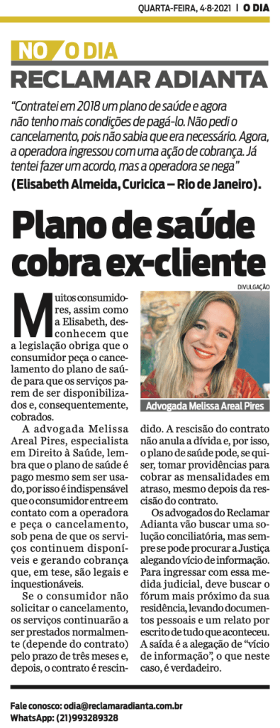 Jornal O Dia – Coluna Reclamar Adianta – Plano de saúde cobra ex-cliente – 04/8/2021
