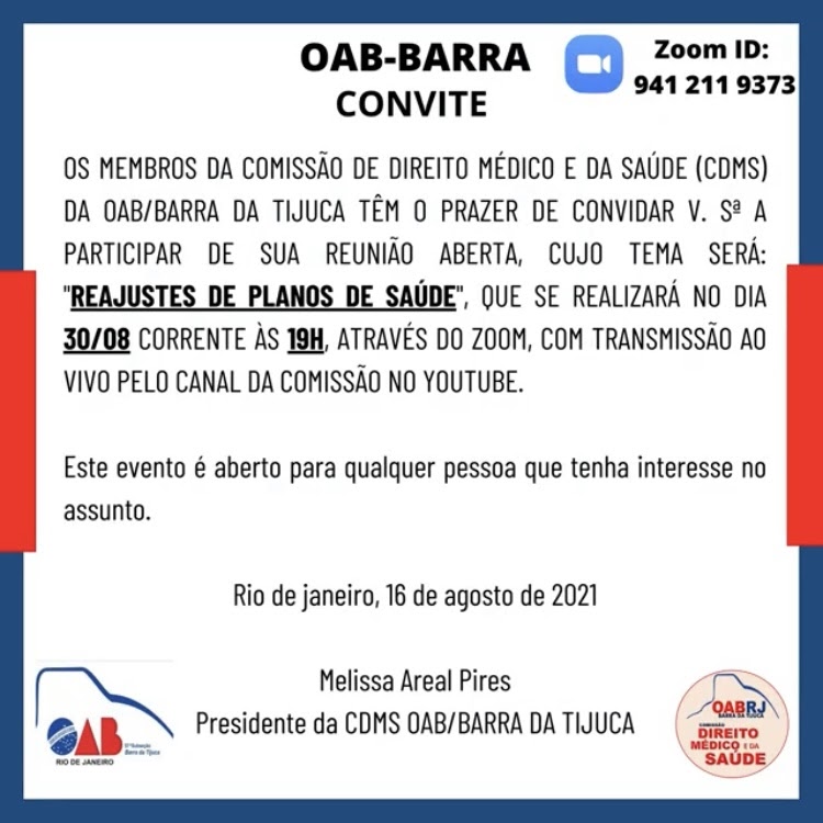 Comissão de Direito Médico e da Saúde da OAB Barra da Tijuca – Reunião Aberta – Reajuste de Planos de Saúde – 30/8/2021