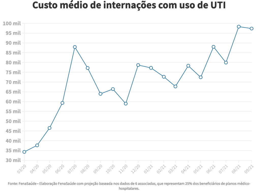 De acordo com o levantamento, um paciente infectado pelo coronavírus que precisou ser internado pelo convênio em UTI em março do ano passado custou R$ 34.200 em média. Esse valor foi crescendo dos meses até chegar ao pico de R$ 98.300 em agosto deste ano, com pequeno recuo em setembro. Agora um paciente internado em UTI custa aos planos R$ 97.300.