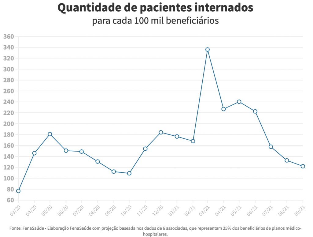 De fato o volume de internados na rede particular vem caindo. O pico foi em março deste ano, quando 336 pessoas foram tratadas em UTI para cada 100 mil beneficiários de planos. Hoje essa relação é de 122, redução contínua desde maio.