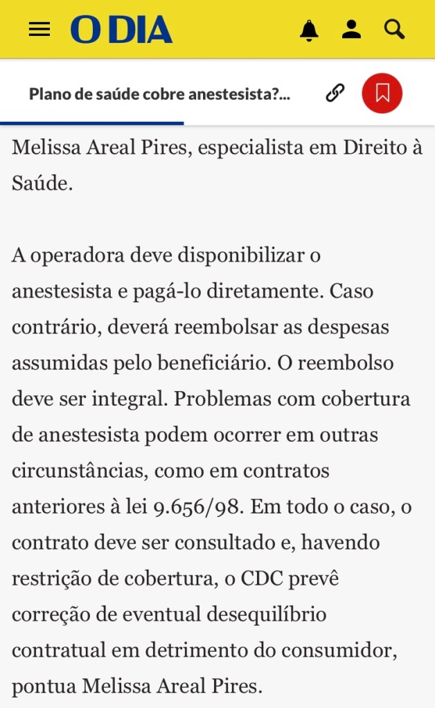 Para contratos celebrados após a Lei 9.656/98 (Lei dos Planos de Saúde), as despesas com anestesia, indicada pelo médico do paciente como necessárias para o procedimento médico, devem sim ser cobertas pela operadora de plano de saúde, uma vez que estão previstas no Rol da ANS (RN 465/21 art 8 II), segundo a advogada Melissa Areal Pires, especialista em Direito à Saúde.