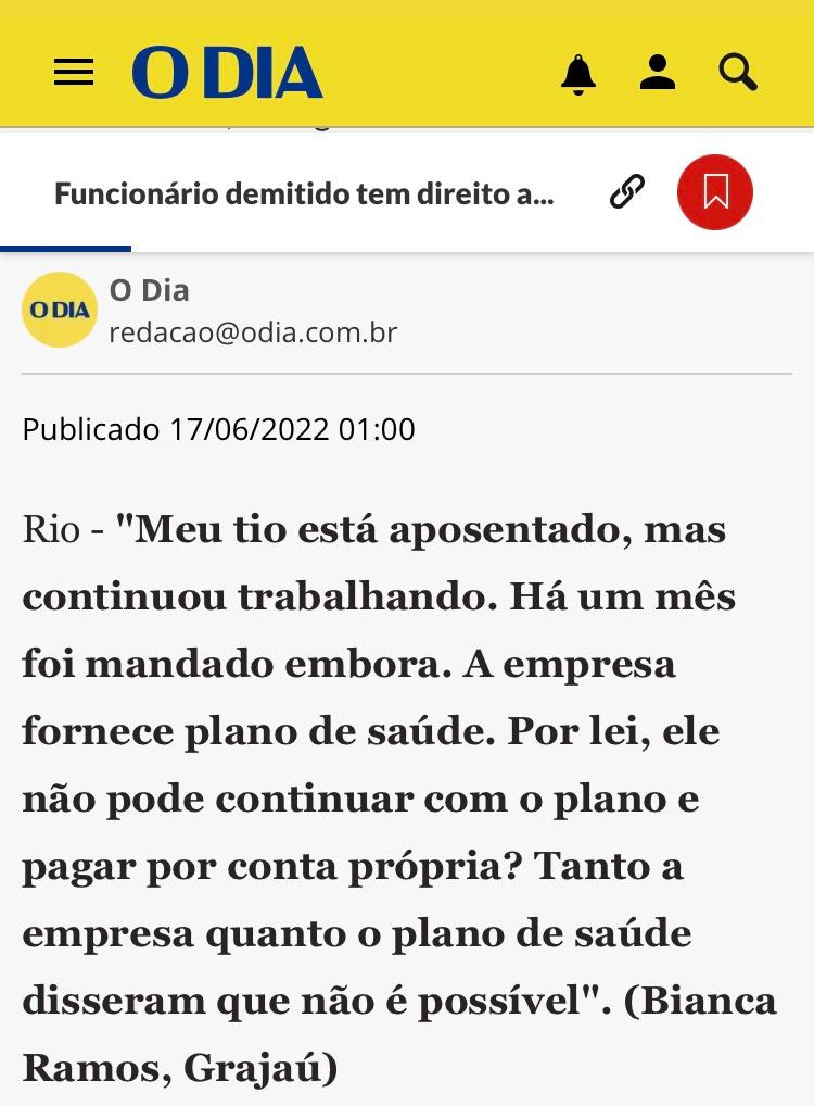 “Meu tio está aposentado, mas continuou trabalhando. Há um mês foi mandado embora. A empresa fornece plano de saúde. Por lei, ele não pode continuar com o plano e pagar por conta própria? Tanto a empresa quanto o plano de saúde disseram que não é possível”. (Bianca Ramos, Grajaú)