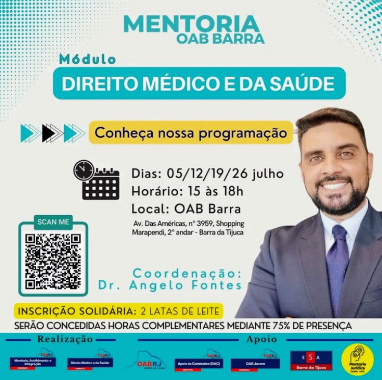 A mentoria é uma realização da Comissão de Direito Médico e da Saúde da OAB Barra da Tijuca @comissaodireitomedicoesaudeoab, presidida pelo Dr. Angelo Fontes @dr.angelofontes, e da Comissão de Mentoria, Acolhimento e Integração @cmai.oabbarrarj, presidida pelo Dr. André Proença @andre.proenca.adv. Além disso, a mentoria conta com os seguintes apoios OABRJ @oabrio, representada pela sua vice presidente Ana Tereza Basílio @anaterezapbasilio; OAB Barra da Tijuca @oabbarrarj, presidida pelo Dr. Marcus Soares @marcussoaresadv; Diretoria de Apoio às Comissões e Diretoria da OAB Jovem, ambas da OAB Barra da Tijuca; Mentoria Jurídica da OABRJ @mentoria, presidida pela Dra Thais Fontes @thaisfontesc; ESA Barra da Tijuca @esa_oabrj.