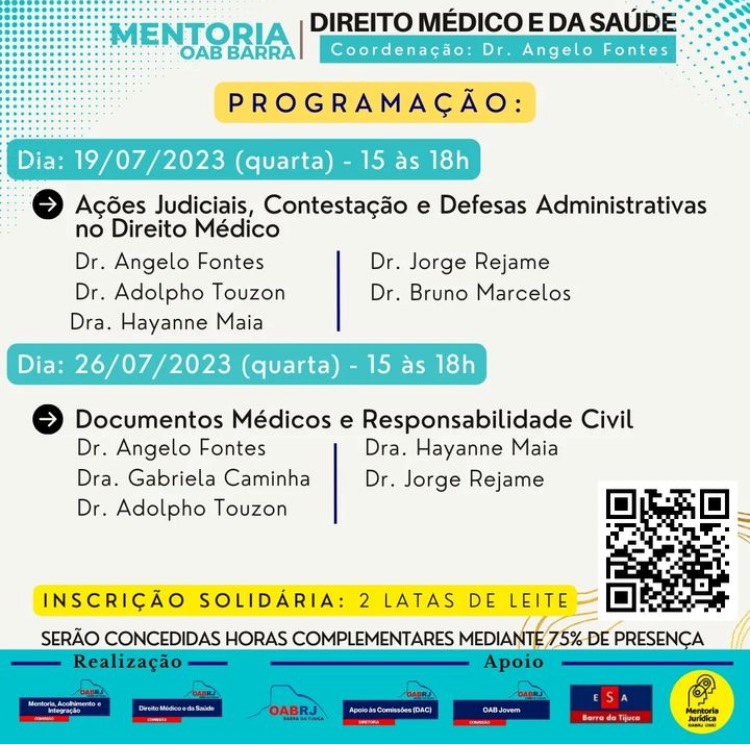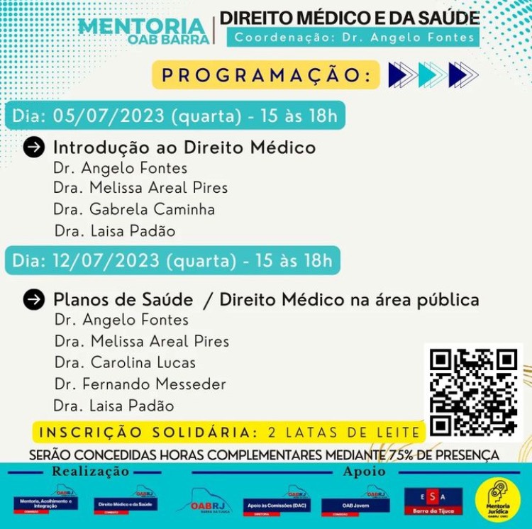 Estão todos convidados para a Mentoria em Direito Médico e da Saúde, a ser realizada nos dias 05, 12, 19 e 26 de julho de 2023, no auditório da OAB Barra da Tijuca, das 15h às 18h.