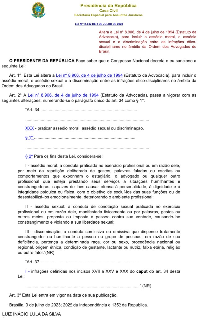 Em 03 de julho de 2023, foi promulgada a lei 14.612 (https://www.planalto.gov.br/ccivil_03/_ato2023-2026/2023/lei/l14612.htm), que altera o Estatuto da Advocacia para incluir o assédio moral e sexual, bem como a discriminação entre as infrações ético disciplinares prevista no rol do art. 34 do referido diploma legal vigente. O projeto de lei teve origem no Conselho Pleno da OAB, que em março deste ano aprovou a proposta por unanimidade. Posteriormente, a matéria foi apresentada ao Congresso e aprovada.