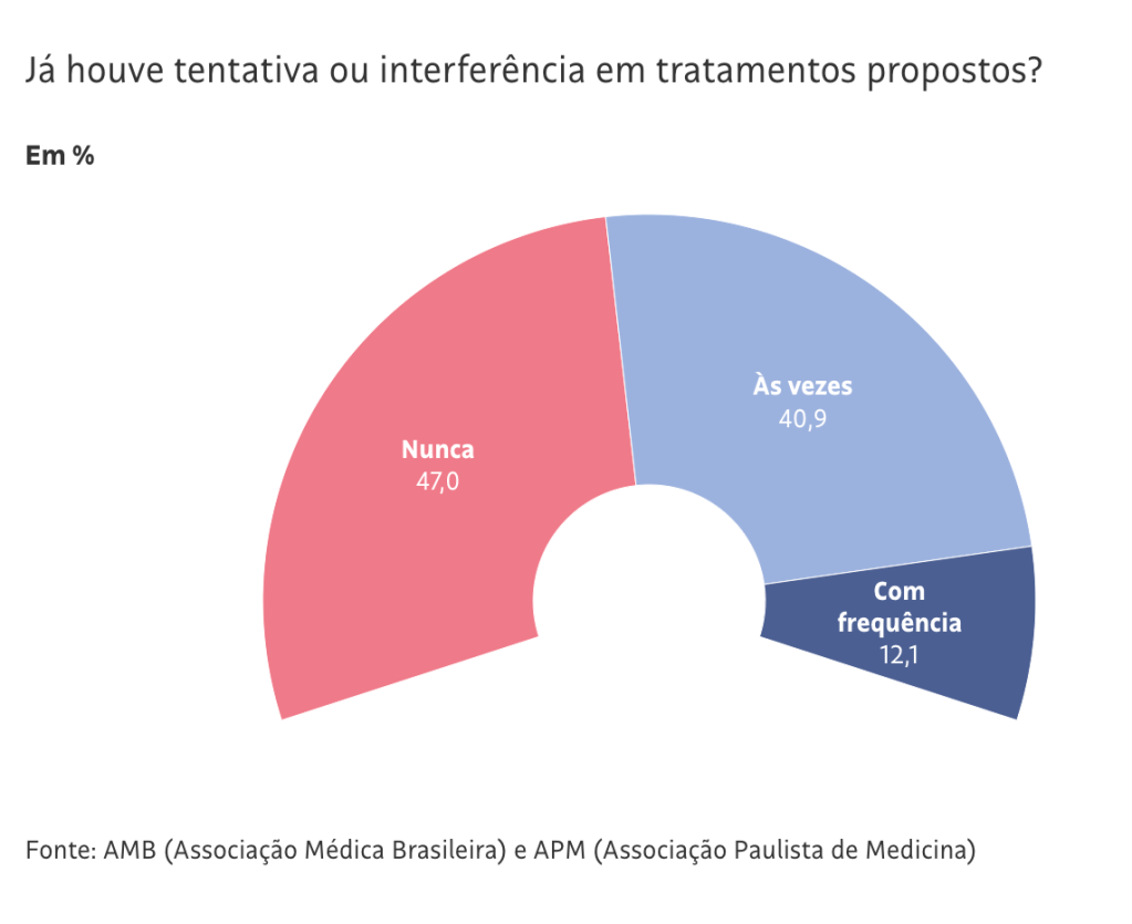 Os dados mostram que 53% dos médicos relatam ter sofrido tentativas ou interferência para alterar os tratamentos que prescreveram aos pacientes. A situação ocorre às vezes para 40,9% deles, e com frequência para 12,2%.