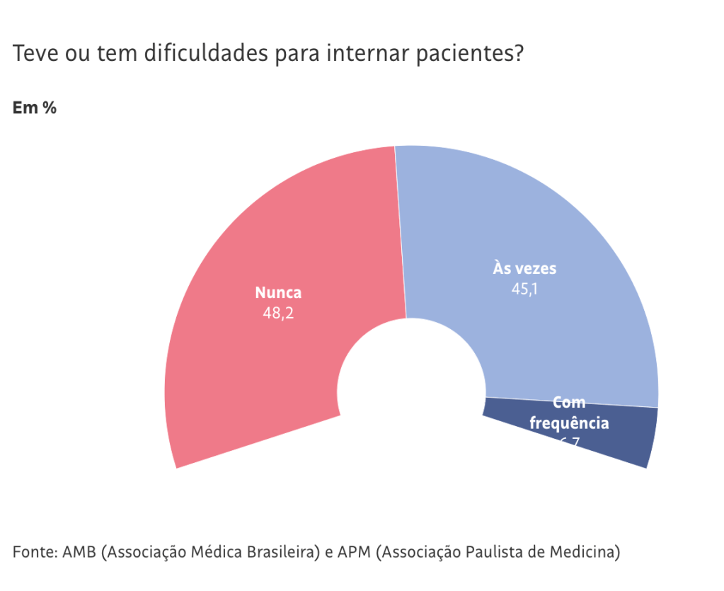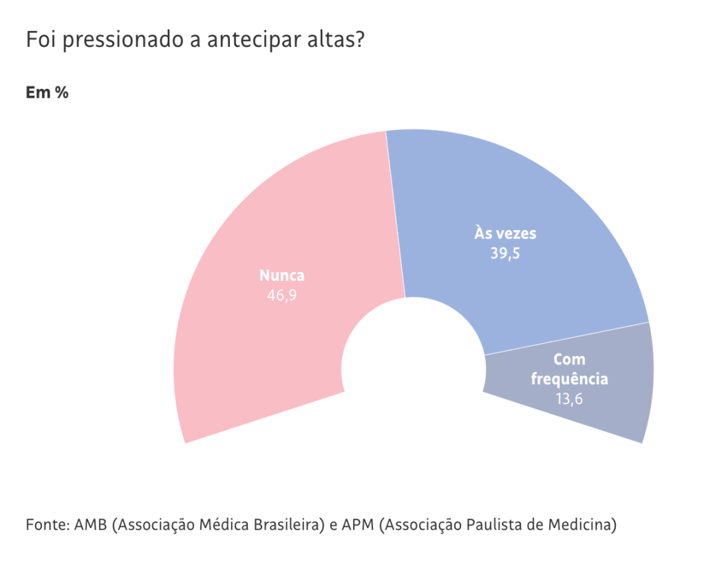 A pesquisa mostra ainda que 51,8% relataram já ter tido dificuldade para internar pacientes, sendo que 6,7% disseram que a situação acontece com frequência. Ainda 53,1% afirmam sofrer ou já terem sofrido pressão para antecipar a alta de pacientes. Desses, 13,6% disseram que a situação é frequente.