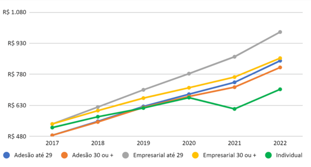 Enquanto a variação do preço médio de mensalidades de planos de saúde individuais – com segmentação ambulatorial e/ou hospitalar, contratados em 2017 para a faixa etária de 39 a 44 anos -, passou de R$ 522,55 para R$ 707,59 em 2022, os coletivos empresariais contratados para grupos com até 29 pessoas (micro e pequenas empresas), saiu de R$ R$ 539,83 para R$ 984,44. Em 2017, apenas os planos por adesão eram mais em conta que os individuais, com o preço inicial de R$485,03, mas mesmo assim, com o decorrer do tempo, eles se mostraram um mau negócio: em 2022, mensalidades médias de contratos de até 29 pessoas passaram a custar R$845,53, e as de contratos maiores, R$813,29. Veja mais no gráfico abaixo: