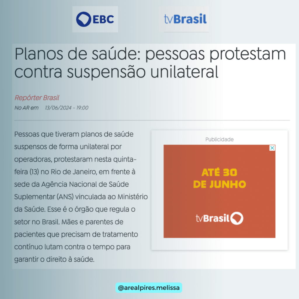 O tema da reportagem foi “Planos de Saúde protestam contra suspensão unilateral” e a minha participação se deu para pontuar os questionamentos legais que envolvem a rescisão unilateral de contratos coletivos pelos planos de saúde.