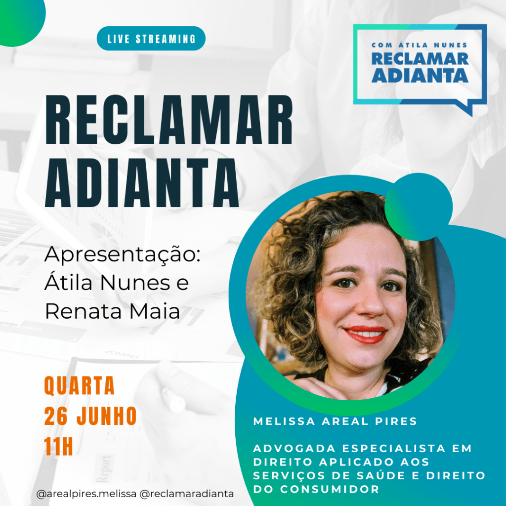 Hoje, 26/6/2024, é dia da minha participação no Reclamar Adianta @reclamaradianta, transmitido ao vivo pelas Rádios Bandeirantes AM 860 (de segunda a sexta-feira, de 10h ao meio-dia) e Metropolitana AM 1090 (de segunda a sexta-feira, de 10h ao meio-dia) e nas redes sociais do programa, apresentado por Átila Nunes @atilanunesoficial e Renata Maia @renata.maia2.