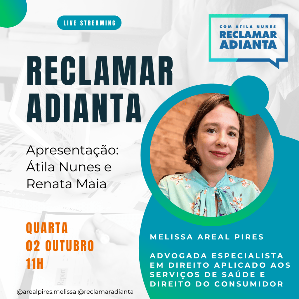 A próxima quarta-feira, 02/10/2024, é dia da minha participação no Programa Reclamar Adianta @reclamaradianta, apresentado pelo Deputado Estadual Átila Nunes @atilanunesoficial e jornalista Renata Maia @renata.maia2.