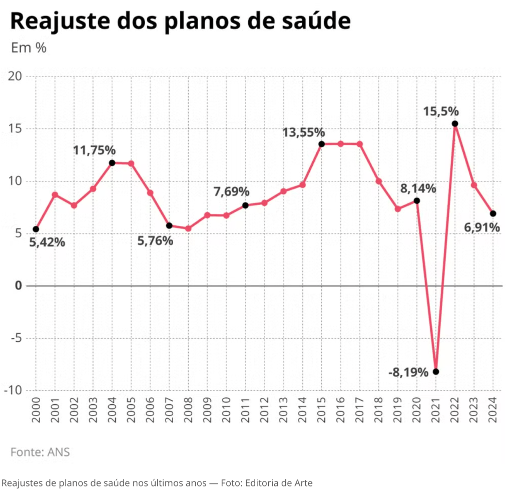 Planos de saúde individuais ou familiares devem ter reajuste de até 6,5% este ano, segundo cálculos de analistas que acompanham o setor de saúde suplementar. O percentual é maior que a inflação de 2024, quando o IBGE calculou o IPCA em 4,83%, mas abaixo do teto de 6,91% definido no ano passado pela Agência Nacional de Saúde Suplementar (ANS). O índice pode ser o menor desde 2008.
