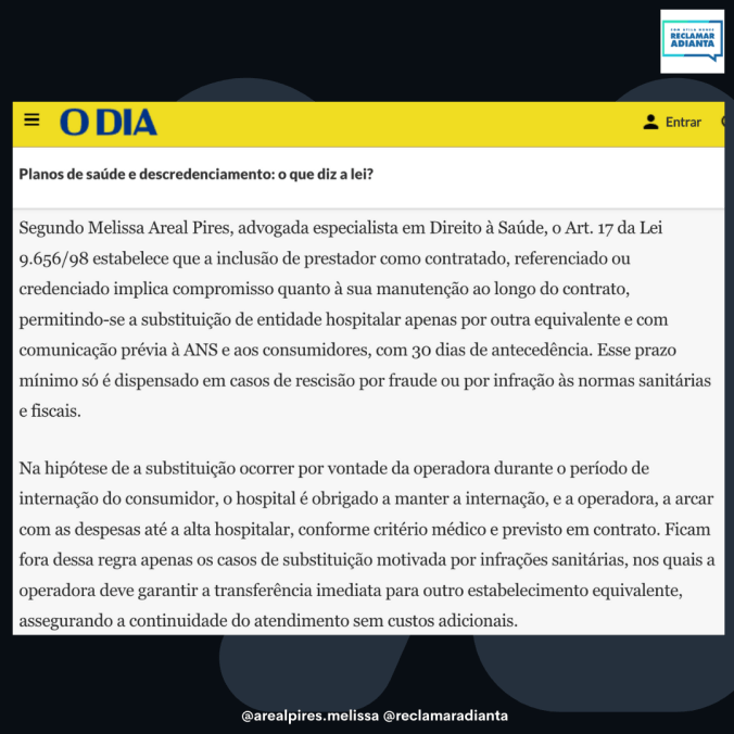 Segundo Melissa Areal Pires, advogada especialista em Direito à Saúde, o Art. 17 da Lei 9.656/98 estabelece que a inclusão de prestador como contratado, referenciado ou credenciado implica compromisso quanto à sua manutenção ao longo do contrato, permitindo-se a substituição de entidade hospitalar apenas por outra equivalente e com comunicação prévia à ANS e aos consumidores, com 30 dias de antecedência. Esse prazo mínimo só é dispensado em casos de rescisão por fraude ou por infração às normas sanitárias e fiscais.