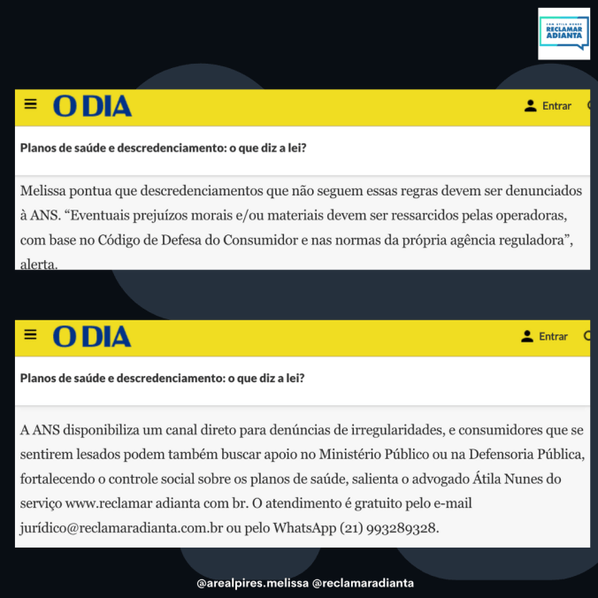 A ANS disponibiliza um canal direto para denúncias de irregularidades, e consumidores que se sentirem lesados podem também buscar apoio no Ministério Público ou na Defensoria Pública, fortalecendo o controle social sobre os planos de saúde, salienta o advogado Átila Nunes do serviço http://www.reclamar adianta com br. O atendimento é gratuito pelo e-mail jurídico@reclamaradianta.com.br ou pelo WhatsApp (21) 993289328.
