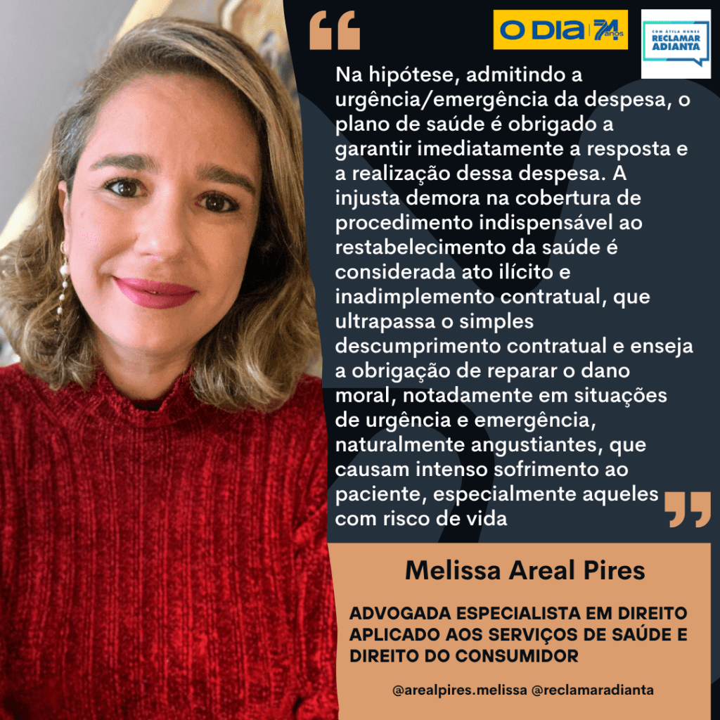 A advogada reforça que a demora na autorização para realização de procedimento médico de urgência ou emergência configura, de forma semelhante, uma recusa de cobertura, o que fere diretamente o direito do consumidor — ainda mais quando a resolução da ANS exige atendimento imediato para esses casos.