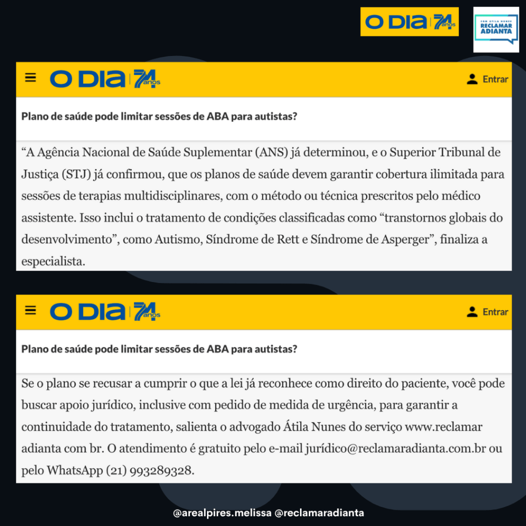 Se o plano se recusar a cumprir o que a lei já reconhece como direito do paciente, você pode buscar apoio jurídico, inclusive com pedido de medida de urgência, para garantir a continuidade do tratamento, salienta o advogado Átila Nunes do serviço http://www.reclamar adianta com br. O atendimento é gratuito pelo e-mail jurídico@reclamaradianta.com.br ou pelo WhatsApp (21) 993289328.