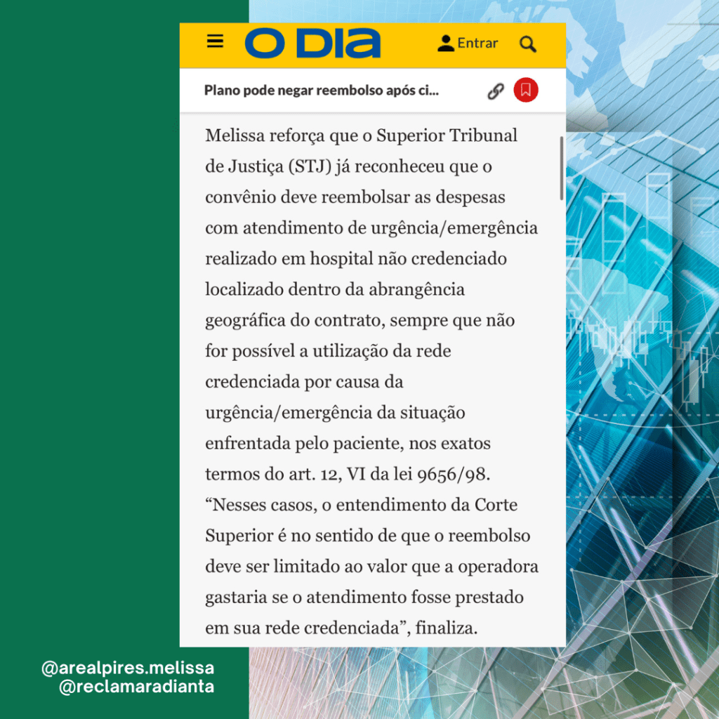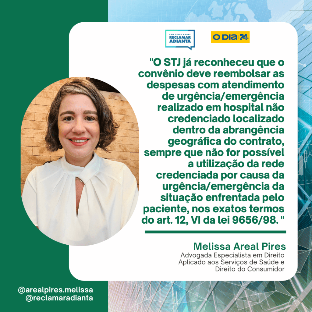 Melissa reforça que o Superior Tribunal de Justiça (STJ) já reconheceu que o convênio deve reembolsar as despesas com atendimento de urgência/emergência realizado em hospital não credenciado localizado dentro da abrangência geográfica do contrato, sempre que não for possível a utilização da rede credenciada por causa da urgência/emergência da situação enfrentada pelo paciente, nos exatos termos do art. 12, VI da lei 9656/98. “Nesses casos, o entendimento da Corte Superior é no sentido de que o reembolso deve ser limitado ao valor que a operadora gastaria se o atendimento fosse prestado em sua rede credenciada”, finaliza.