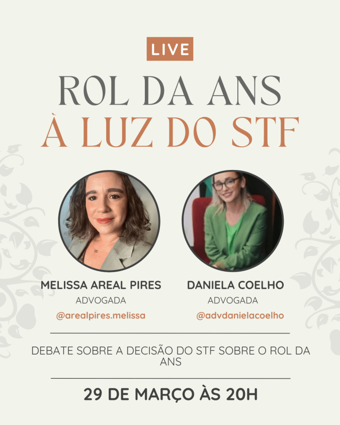 Assista a live com a participação das advogadas Melissa Areal Pires e Daniela Coelho, membros da Comissão de Defesa do Consumidor da OAB/RJ, que debateu a decisão do STF proferida em 18/9/2025 acerca da obrigação dos planos de saúde de cobrirem tratamentos que não estejam previstos no Rol da ANS.