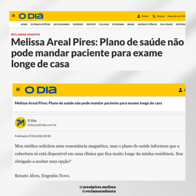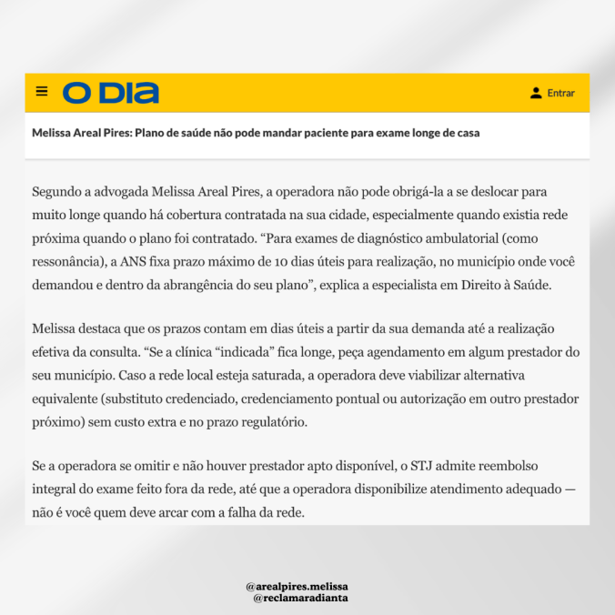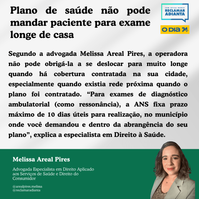 Segundo a advogada Melissa Areal Pires, a operadora não pode obrigá-la a se deslocar para muito longe quando há cobertura contratada na sua cidade, especialmente quando existia rede próxima quando o plano foi contratado. “Para exames de diagnóstico ambulatorial (como ressonância), a ANS fixa prazo máximo de 10 dias úteis para realização, no município onde você demandou e dentro da abrangência do seu plano”, explica a especialista em Direito à Saúde.