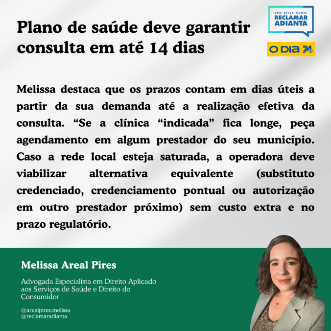 Melissa destaca que os prazos contam em dias úteis a partir da sua demanda até a realização efetiva da consulta. “Se a clínica “indicada” fica longe, peça agendamento em algum prestador do seu município. Caso a rede local esteja saturada, a operadora deve viabilizar alternativa equivalente (substituto credenciado, credenciamento pontual ou autorização em outro prestador próximo) sem custo extra e no prazo regulatório.