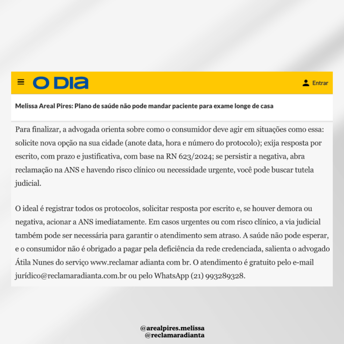 O ideal é registrar todos os protocolos, solicitar resposta por escrito e, se houver demora ou negativa, acionar a ANS imediatamente. Em casos urgentes ou com risco clínico, a via judicial também pode ser necessária para garantir o atendimento sem atraso. A saúde não pode esperar, e o consumidor não é obrigado a pagar pela deficiência da rede credenciada, salienta o advogado Átila Nunes do serviço http://www.reclamar adianta com br. O atendimento é gratuito pelo e-mail jurídico@reclamaradianta.com.br ou pelo WhatsApp (21) 993289328.