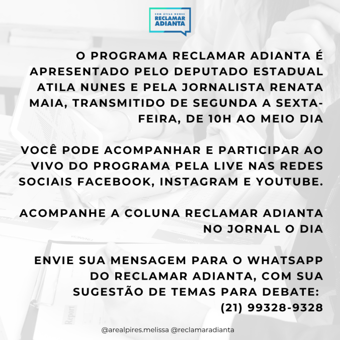 Você pode também enviar sua mensagem de áudio ou vídeo para o WhatsApp do programa: (21) 99328-9328 e ainda acompanhar a coluna do Reclamar Adianta no Jornal O Dia @odiaonline.