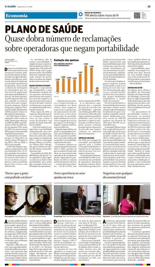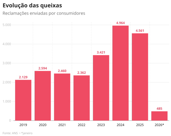 Em 2022, foram 2.362 reclamações sobre o tema na ANS, número que saltou para 4.964 em 2024 e caiu levemente a 4.561 em 2025, ainda um patamar 93% acima de 2022. Em janeiro, foram 485 queixas, acima da média mensal de um ano antes.